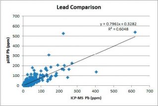 來自加拿大的金元素勘探項目,XRF分析儀在野外繪制的表面土壤中As、Cu和Pb元素等值線圖對比ICP分析。